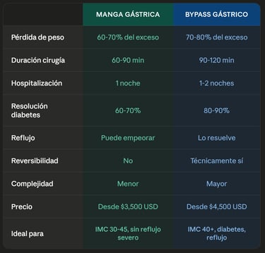 Depende de tu caso. El bypass es superior para pacientes con diabetes tipo 2, reflujo severo o IMC muy alto (40+). La manga es preferible para pacientes con IMC 30-40 sin estas complicaciones. En tu consulta determinamos cuál es la mejor opción para ti.