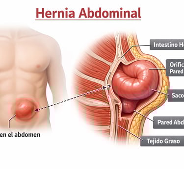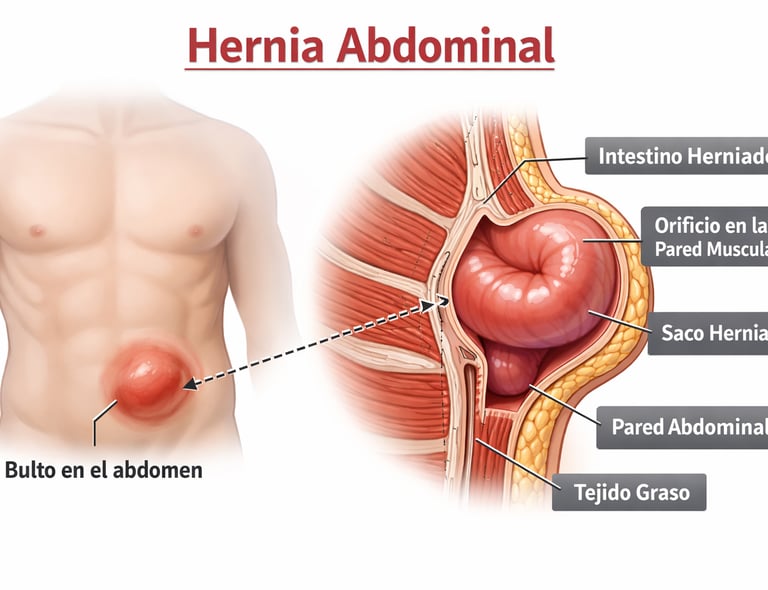 Una hernia ocurre cuando un órgano o tejido interno se asoma a través de un punto débil en la pared muscular que lo contiene. Imagina que es como cuando el relleno de un cojín se sale por una costura abierta.